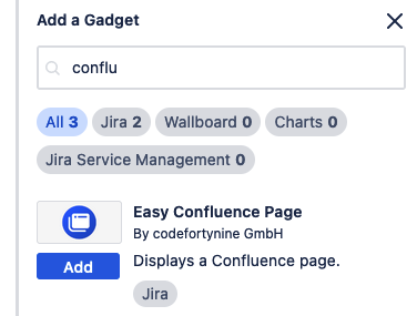 You’ll be able to add new dashboard gadgets on the right-hand side. Make sure to select the “Easy Confluence Page” gadget and click on “Add”: