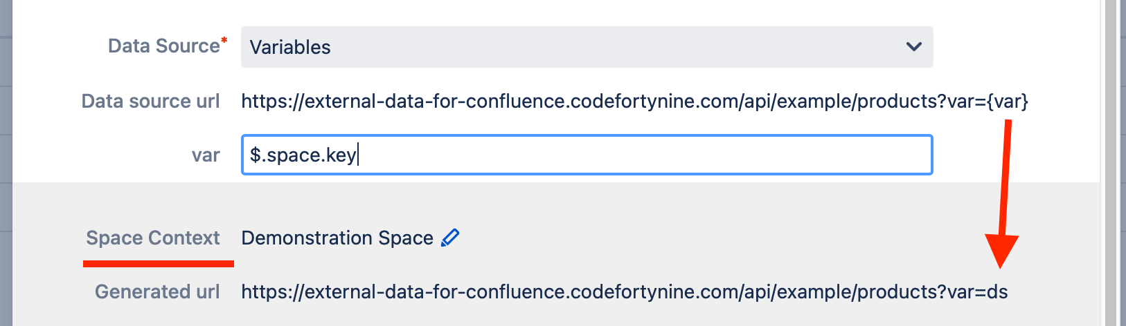 You can also send context values to your data source. Either space or user information are available to use. The space context can be changed (see image below) to evaluate a specific context. The user information refers always to the current user.