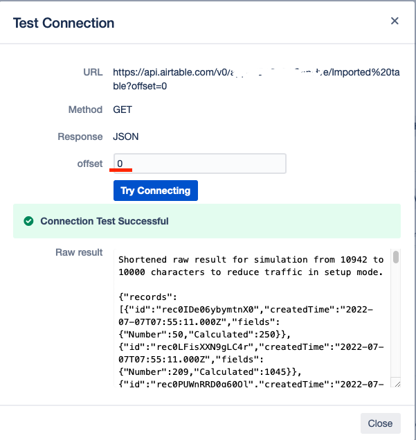 First, create a simple URL/REST data source. Use the List records endpoint that you can find in your Airtable API documentation as the URL. Make sure to add the variable offset={offset} to the end of the URL.