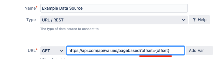Creating a new data source and using the type Paginated Data Source will have you select the data source you want to paginate over followed by the pagination type. In this case, we use Offset-based and select the previously created offset variable in the Offset Variable selection.