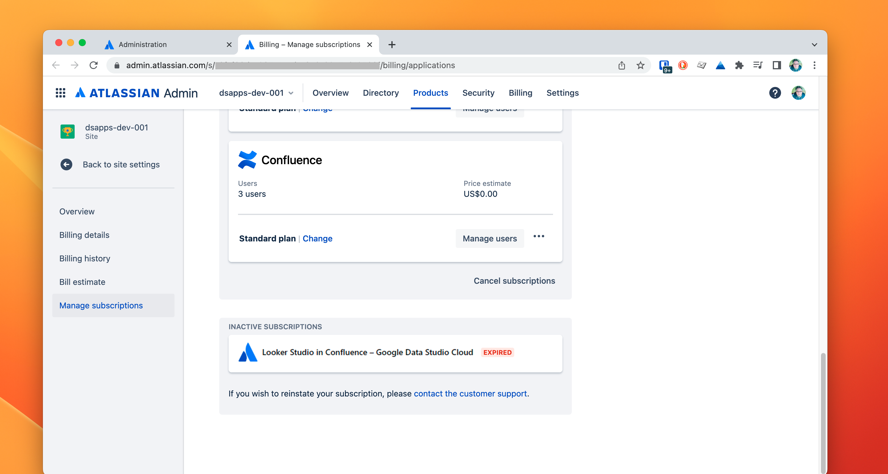 In Billing Preview, select the product you are using, e.g. Confluence, and press the Manage link: