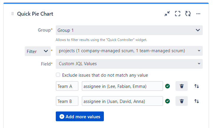 You can select “Custom JQL Values” in the field dropdown menu to provide up to 10 custom JQLs. Work items are matched against these JQLs and displayed accordingly in the Pie Chart. Please be aware that one work item can match multiple JQLs.