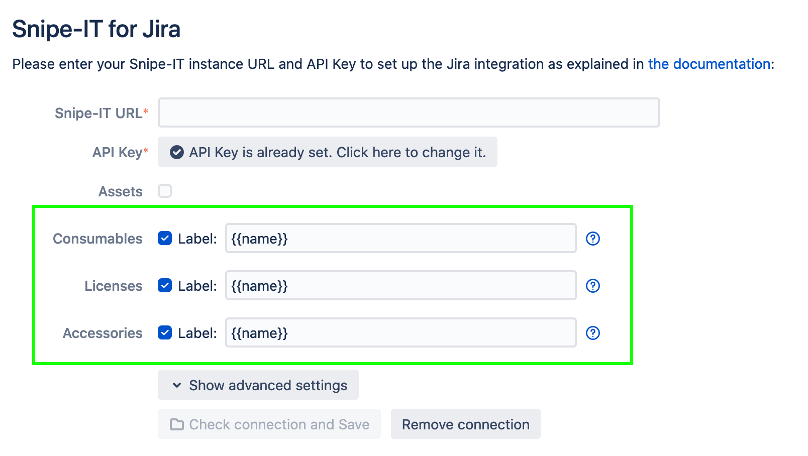 On top of syncing assets, Snipe-IT for Jira supports syncing consumables, licenses, and accessories. This can be enabled by selecting the corresponding checkboxes upon setting up the connection.