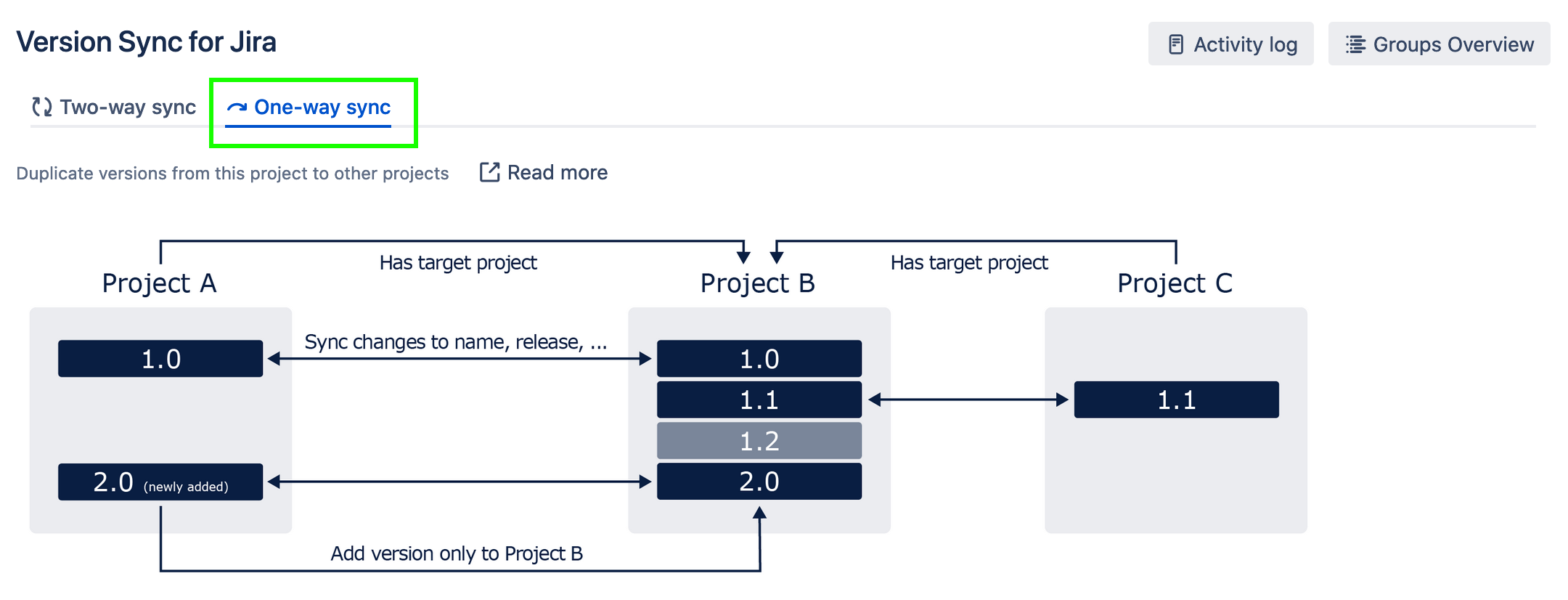 A one-way sync is a directed sync from a source/master project to one or more target projects.